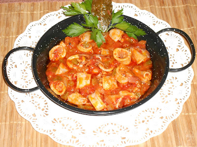 Cuando rompa el hervor añadimos el tomate frito y dejamos guisar hasta que los chipirones estén tiernos (aproximádamente unos 20 min.)