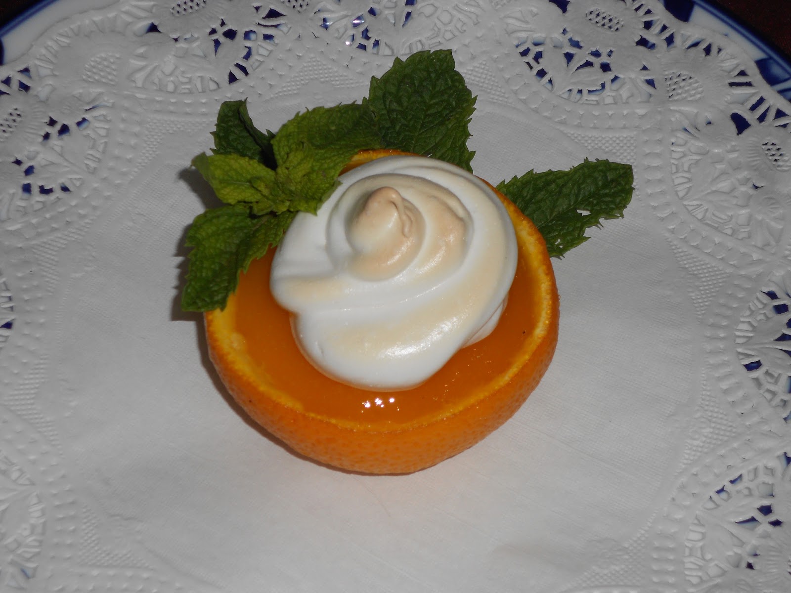 Ponemos una "nube" de merengue encima de cada naranja e introducimos al horno a 200ºC hasta que se gratine y se dore el merengue.