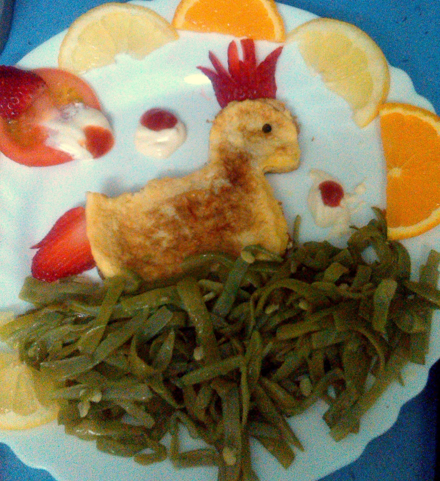 Con un molde hice una tortilla a la francesa normal y corriente en forma de pato y con un poco de judías verdes hice el mar. Evidentemente podéis usar las verduras que más os gusten y darle la forma que mejor os convenga.