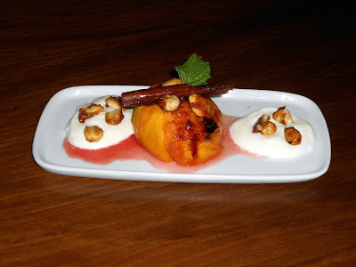 Ponemos un poco de crema en el plato junto al melocotón con el almíbar resultante de la cocción por encima y acompañamos de los frutos secos caramelizados.